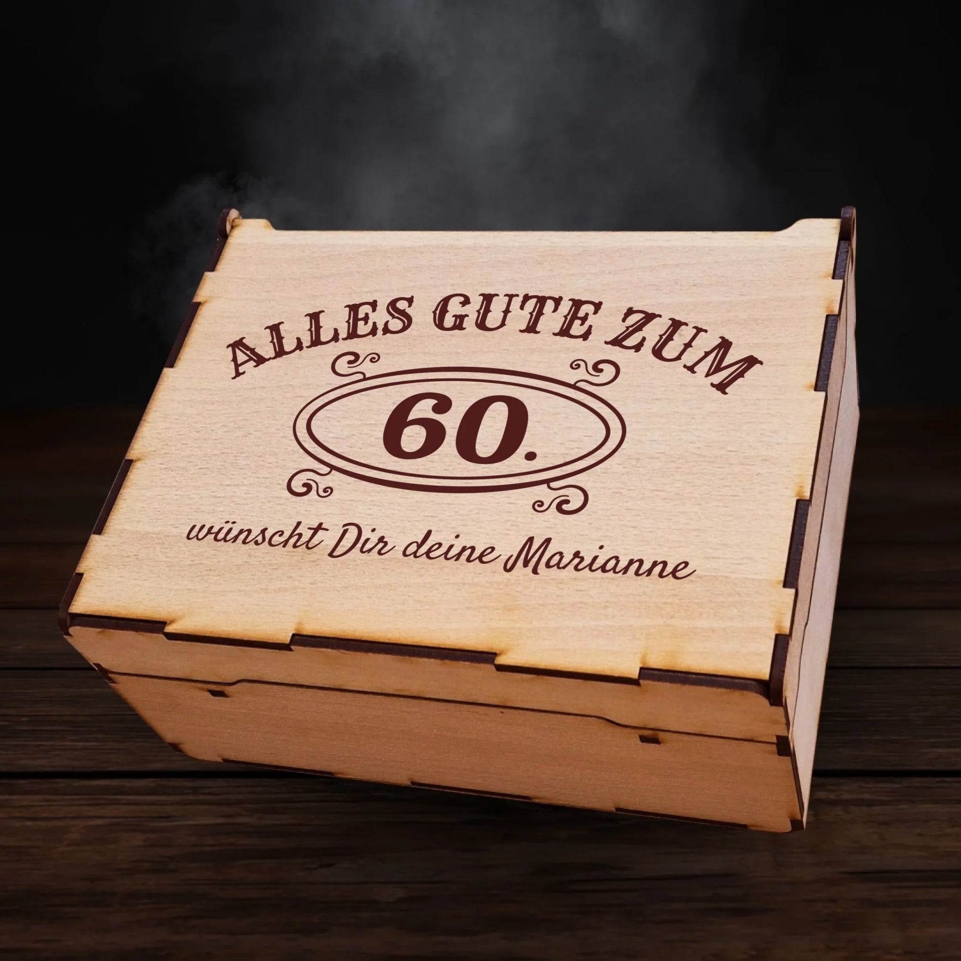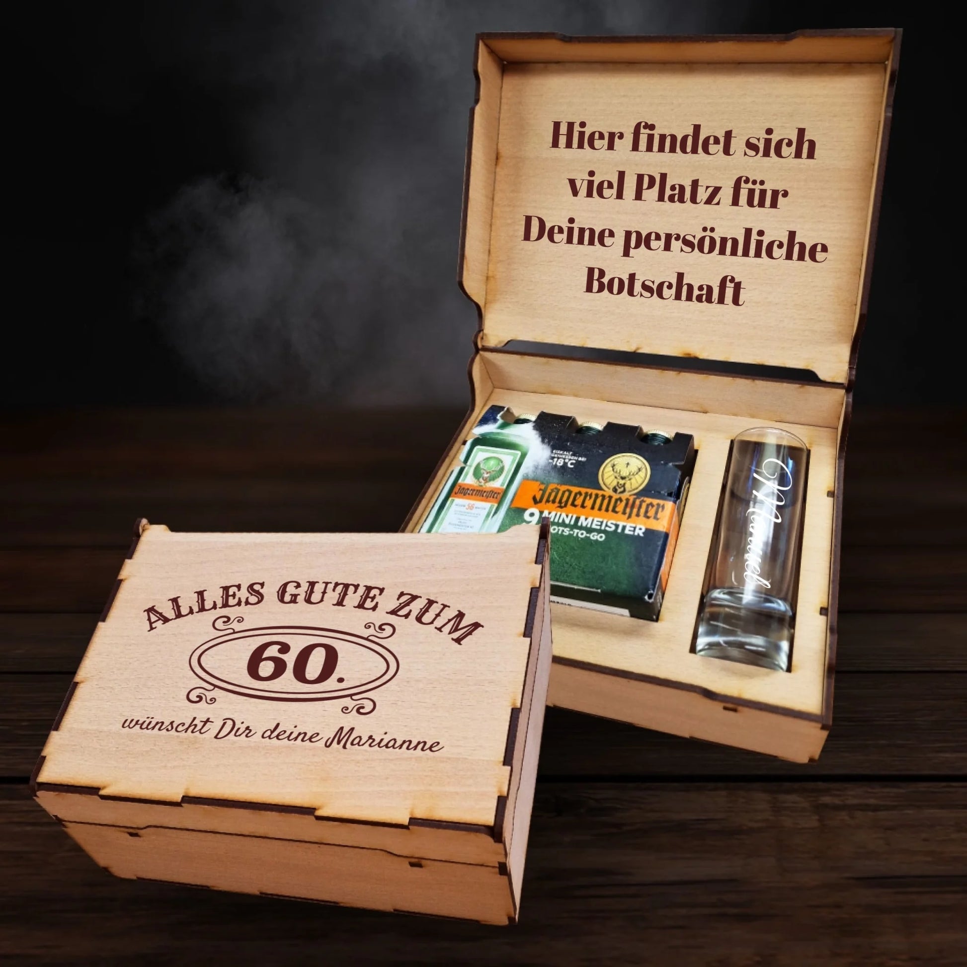 Mache einen besonderen Anlass noch unvergesslicher mit unserer personalisierten Jägermeister-Geschenkbox! Diese hochwertige Holzbox, gefertigt aus edlem HDF-Holz, wird individuell mit deinem Wunschmotiv graviert – ein Geschenk mit Stil und Persönlichkeit.